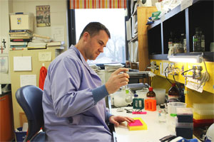 Dr.Petersen is investigating the mechanisms used to repair UV-induced DNA damage. More specifically, he is using molecular genetic techniques to identify genes involved in DNA repair and molecular and cellular biology to characterize the roles that these genes play in their respective DNA repair process. Cells are subject to DNA damage induced by the ultraviolet (UV) component of sunlight. This damage can be mutagenic and potentially carcinogenic. The leading form of DNA damage caused by UV light, the cyclobutene pyrimidine dimer, has been shown to be the primary cause of non-melanoma skin cancer. To combat the damaging effects of UV light, cells have developed methods to repair this UV-induced DNA damage. The significane of these repair mechanisms is clear. When a form of DNA repair known as nucleotide excision repair is defective in humans, it results in a 1,000 fold increased incidence of skin cancer.